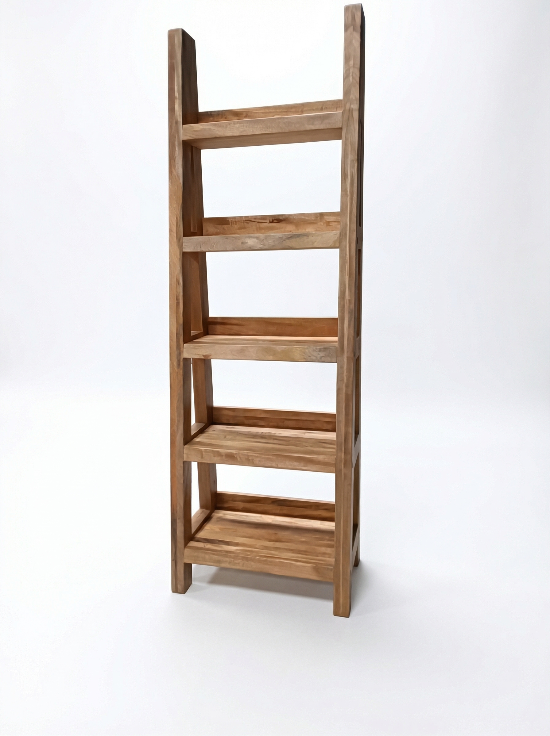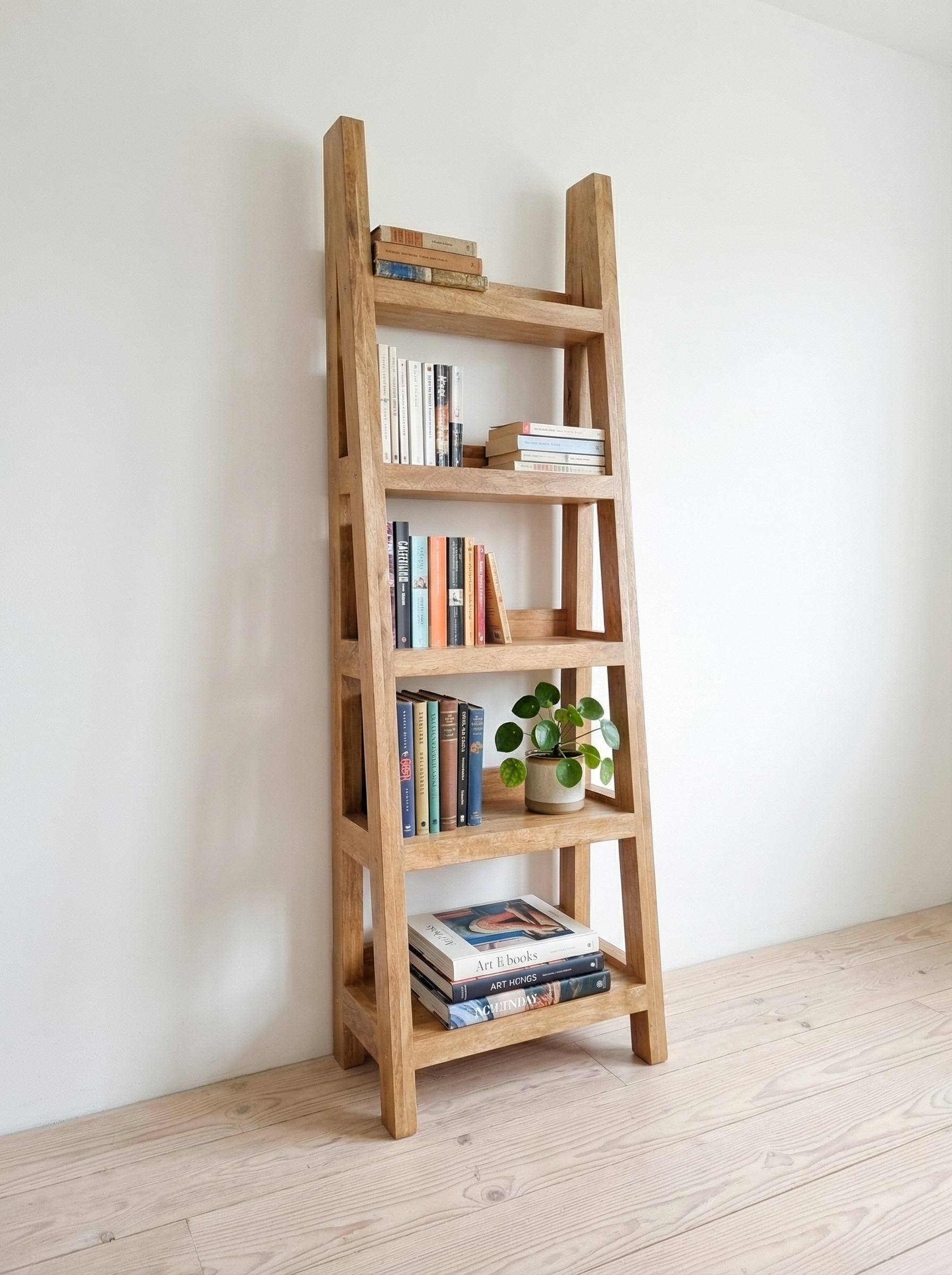 Despite its light, vertical appearance, the structure is solid and stable. The thick wooden frame and well-spaced shelves provide reliable support without adding visual bulk.