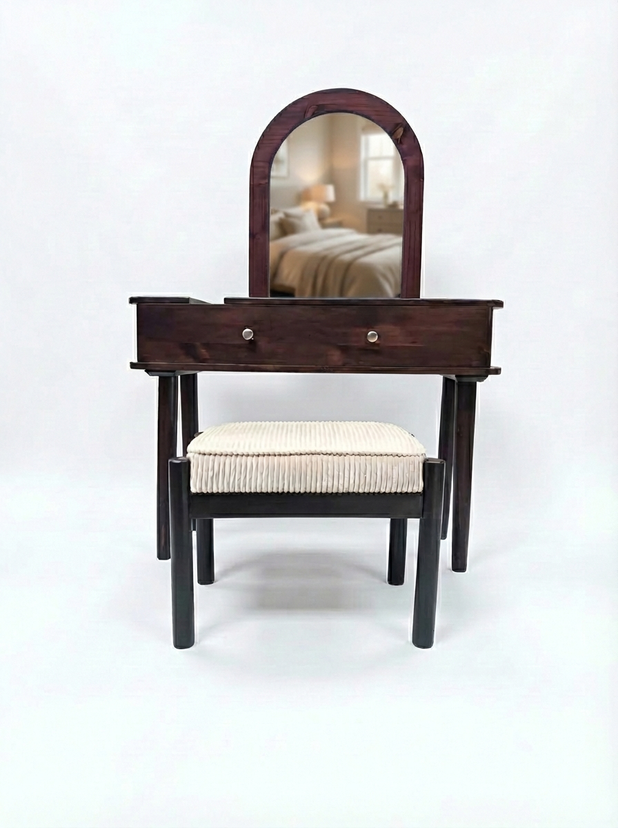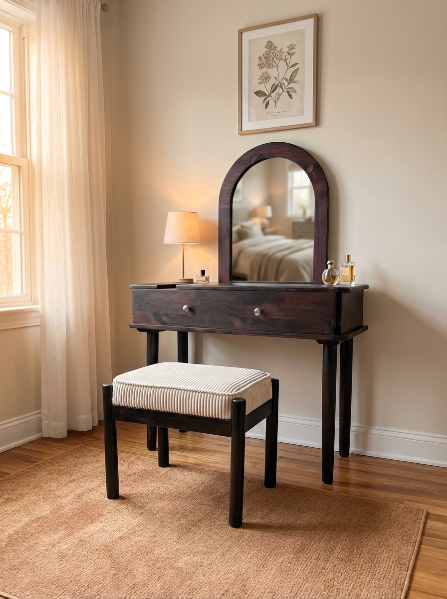 Rounded edges and the arched mirror add softness, making it feel more personal than standard dressing tables.