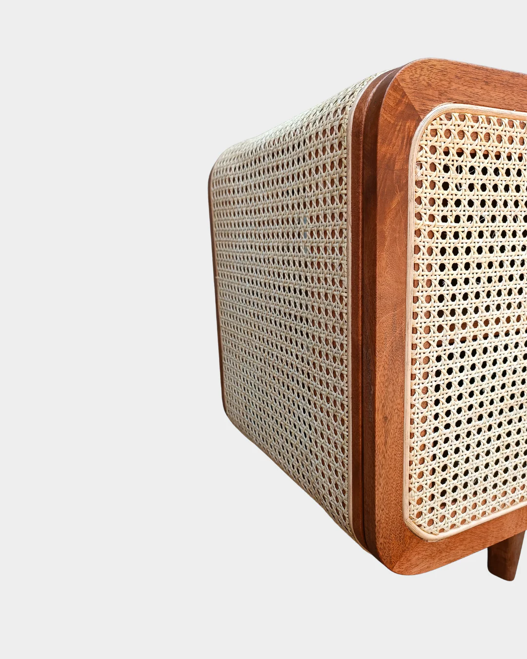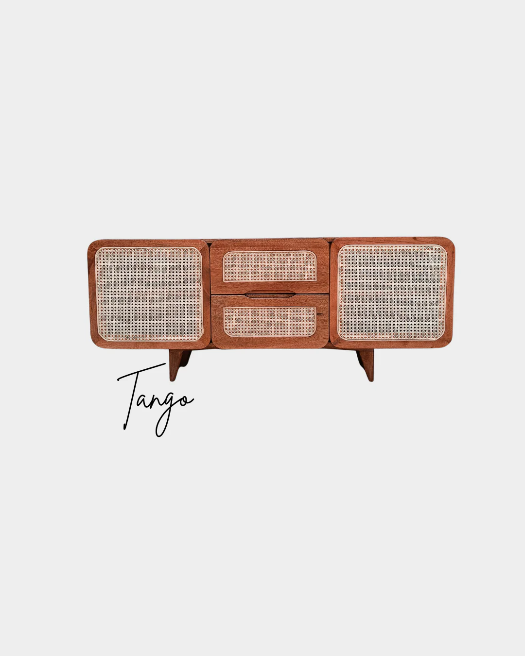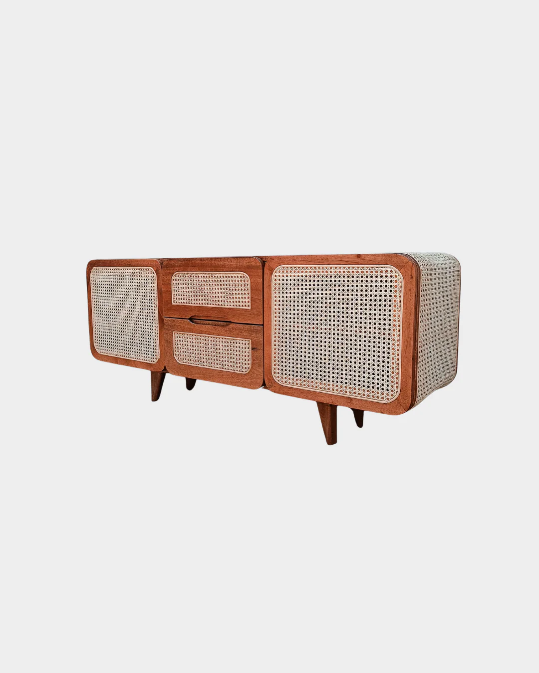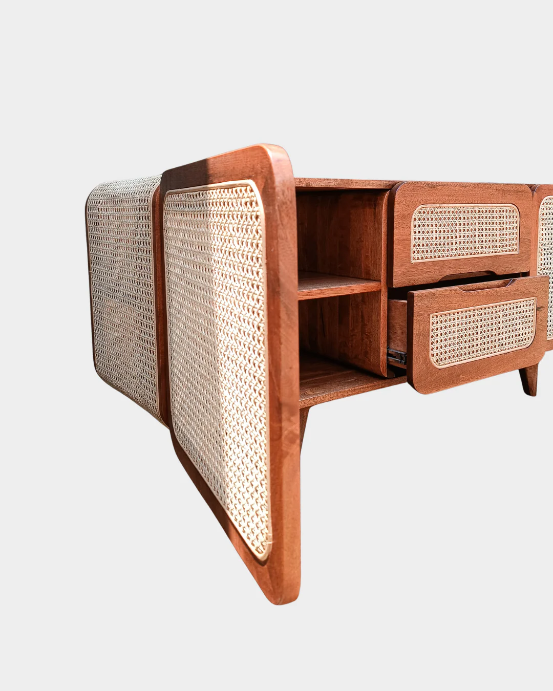 This TV unit is crafted from mango wood and detailed with natural rattan. Its smooth, rounded edges and airy cane panels give off a light, mid-century modern vibe—while the generous storage keeps your living room calm and clutter-free.