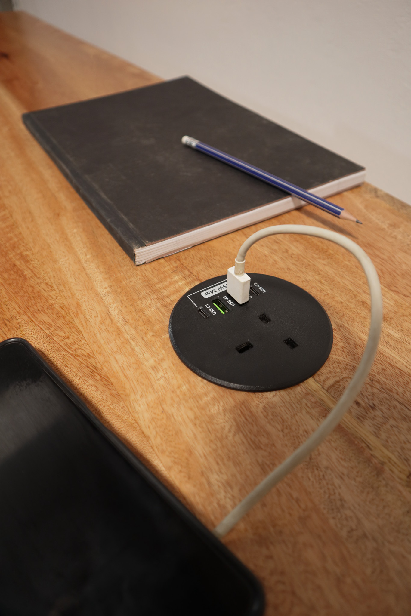 Two spacious drawers keep everyday essentials neatly stored, while the built-in charging port allows you to conveniently power your laptop, phone, or lamp.